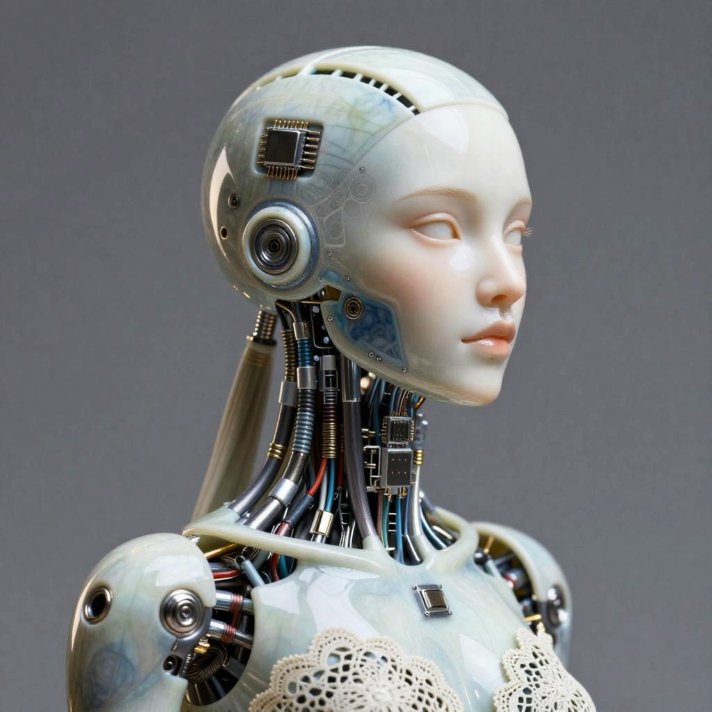 Digital CGI of a white-haired, humanoid robot with exposed skeletal structure, mechanical joints, and intricate wiring, in profile view.