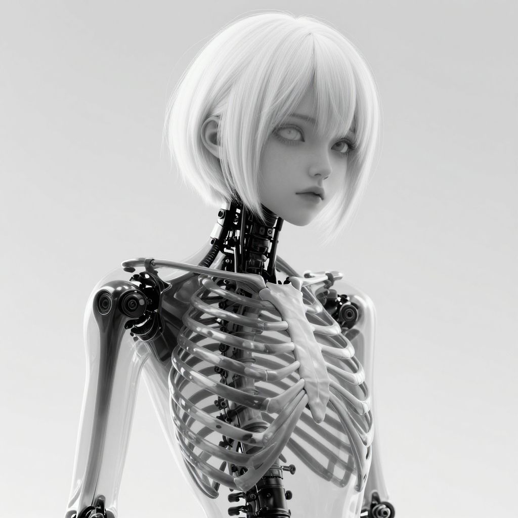 Masterpiece, best quality, upper body, from side, solo, 1girl, spine, short hair, monochrome, bone, standing, transparent, ribs, skeleton, looking at viewer, greyscale, mechanical parts, hair over one eye, white hair, shiny, robot joints, black