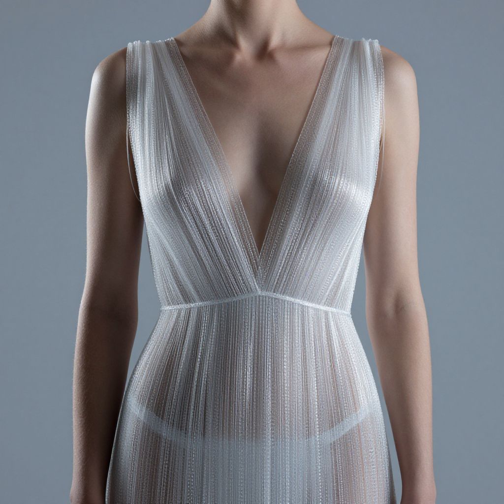 Photograph of a slender woman wearing a sheer, silver, V-neck gown with intricate, textured fabric, highlighting her collarbones and cleavage against a