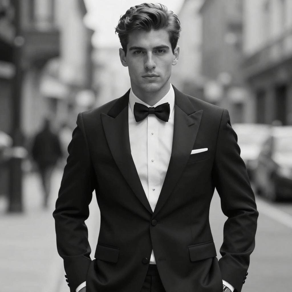 Black and white photograph of a handsome young man with short, styled dark hair, wearing a classic black tuxedo with a bow tie and white pocket square. He's standing with hands in his pockets, looking serious. The lighting is even, highlighting his features. The camera angle is straight-on, with a shallow depth of field that keeps the background completely blurred. The image has a high contrast, giving it a dramatic look.