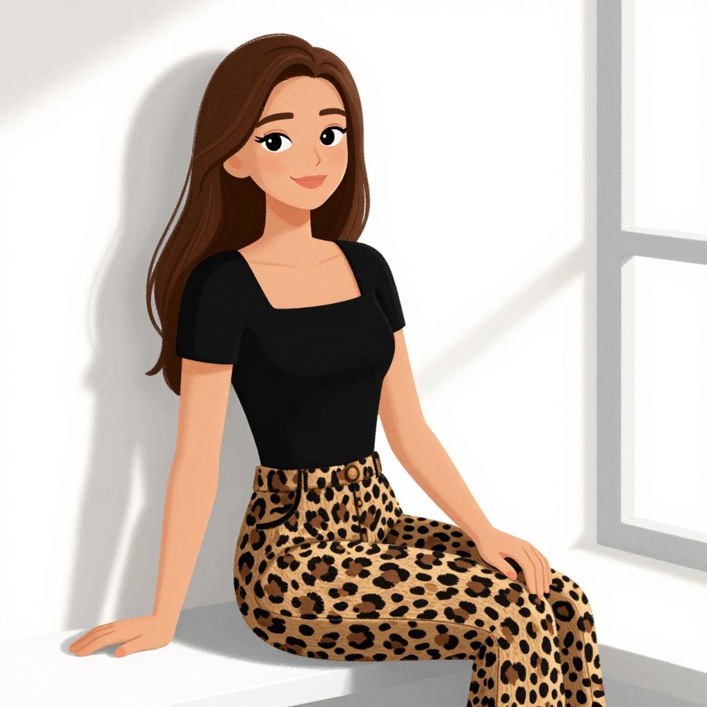A digital drawing of a cute, young woman with fair skin and long brown hair. She's wearing a black, short-sleeve, square-neck top and high-waisted, leopard-print pants. She's sitting on a window sill, smiling, with her right hand resting on the sill and her left hand on her lap. The background is a bright white wall with a shadow of her to the left.