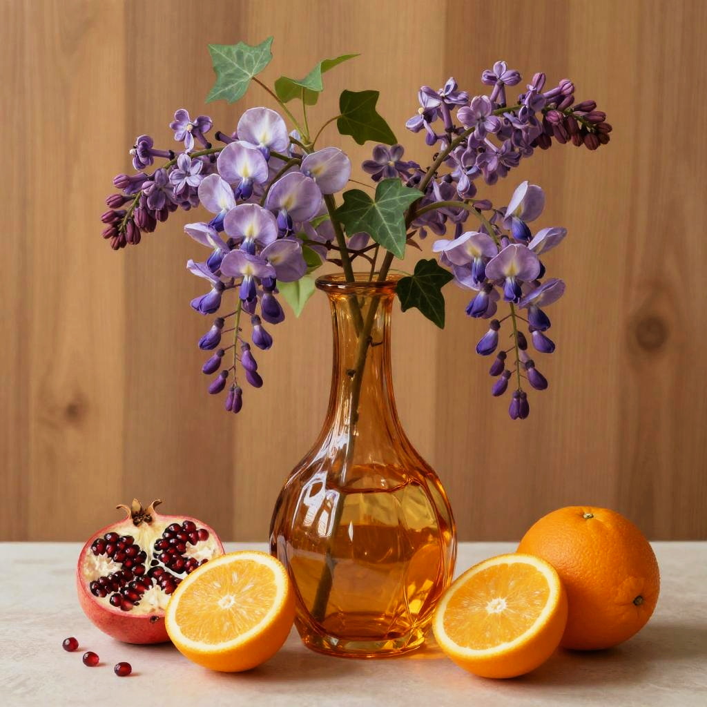 A still life painting of a translucent amber glass decanter with faceted sides brimming with wisteria blooms, purple lilacs, and trailing ivy. In front rest a sliced orange with seeds, a halved pomegranate, and a whole orange on a clean surface; the warm honey toned wood paneling keeps focus on form and color. Warm, balanced composition, soft natural light, gentle shadows, crisp edges, high detail, tasteful negative space, editorial quality, SDXL ready.