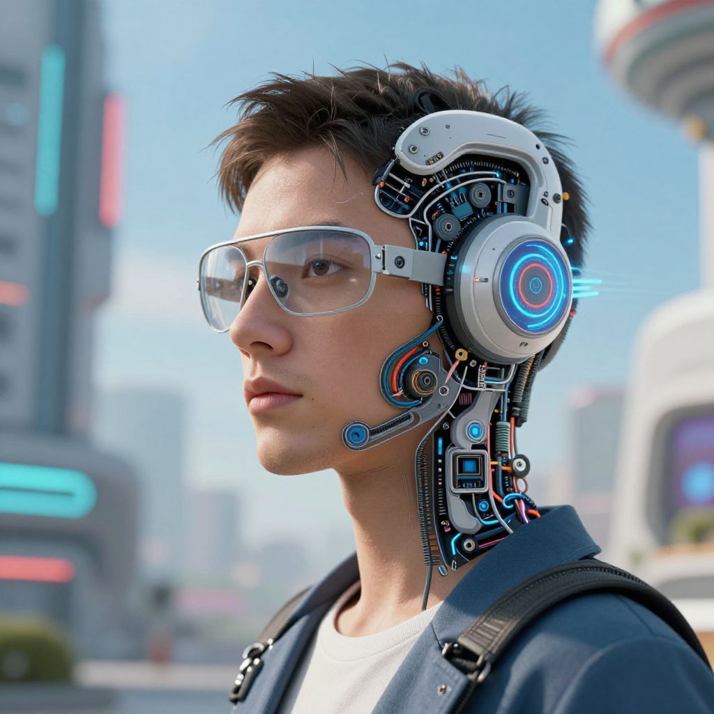 Photorealistic digital illustration of a young Asian man with short, dark hair, wearing large, reflective sunglasses and futuristic, cybernetic headphones with glowing blue accents and intricate mechanical details. He is dressed in a white shirt and a dark blue jacket, with a black backpack strap visible on his right shoulder. The background features a blurred, vibrant cityscape with tall buildings and neon lights, suggesting a futuristic urban setting. The man's expression is neutral, and the overall style blends science fiction and realism. The image is sharp with high contrast, emphasizing the cybernetic elements against the bright, clear sky.