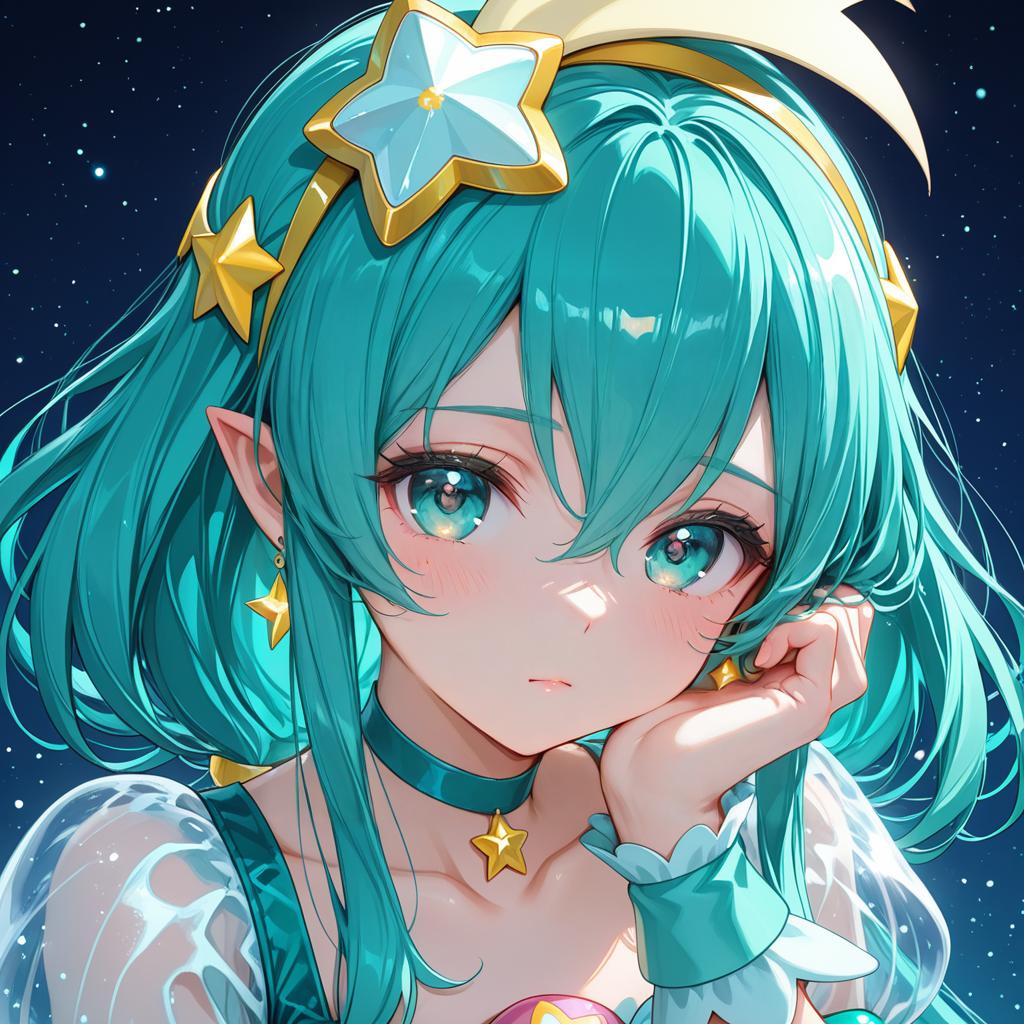 Close-up digital illustration of an anime-style magical girl with aqua blue hair, star-shaped pupils, and aqua eyes. She has pointy elf-like ears, wears a yellow star hairband, star earrings, and an aqua choker with a star pendant. Her outfit features see-through puffy sleeves and wrist cuffs. The background is a starry night sky, emphasizing the celestial theme.