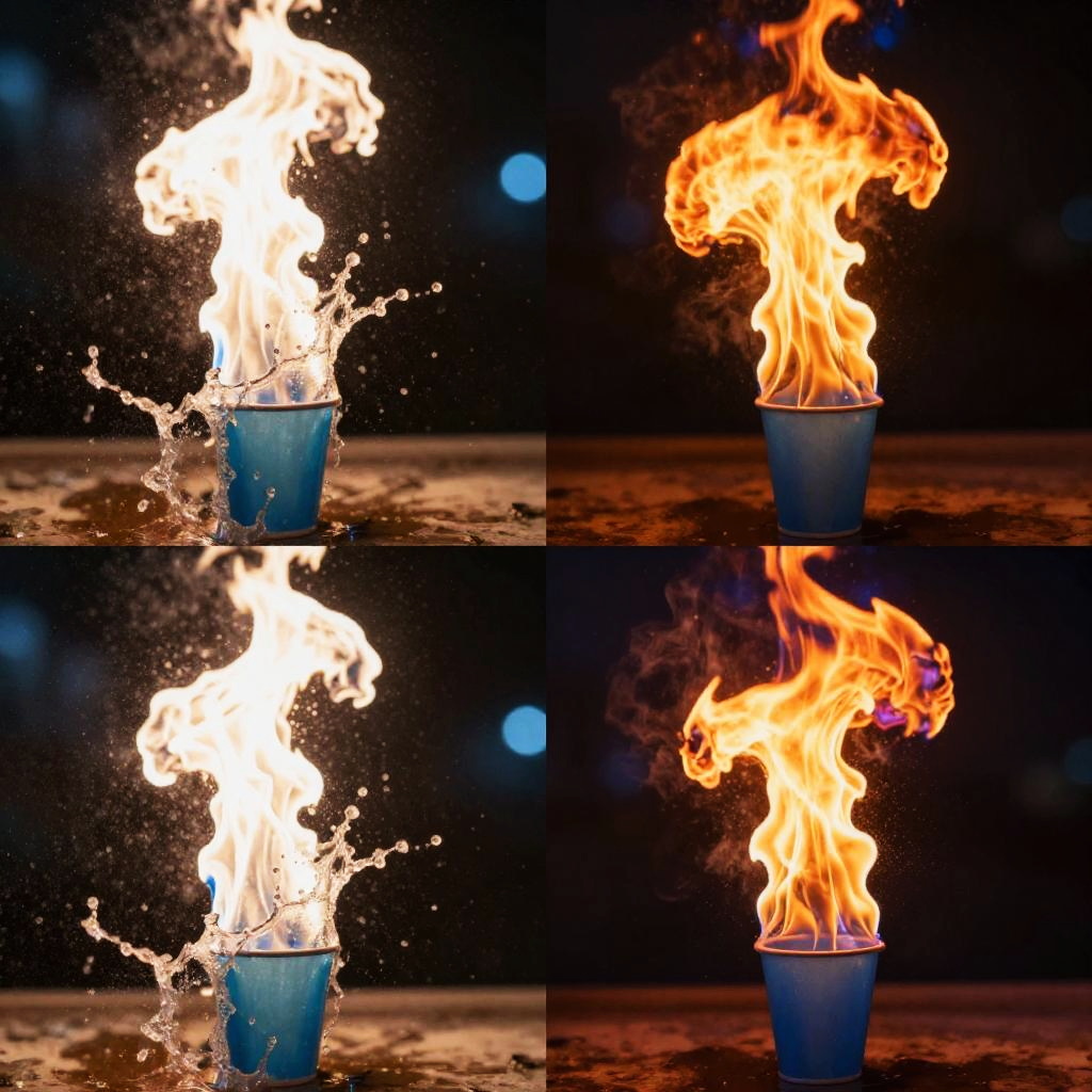 This is a vibrant, four-panel photograph showcasing dynamic splashes of water and fire hitting a small blue cup. Each panel captures a different moment of the impact, with the top left and bottom left panels highlighting bright white water splashes, while the top right and bottom right panels feature colorful, fiery explosions. The background is dark, making the action pop.
