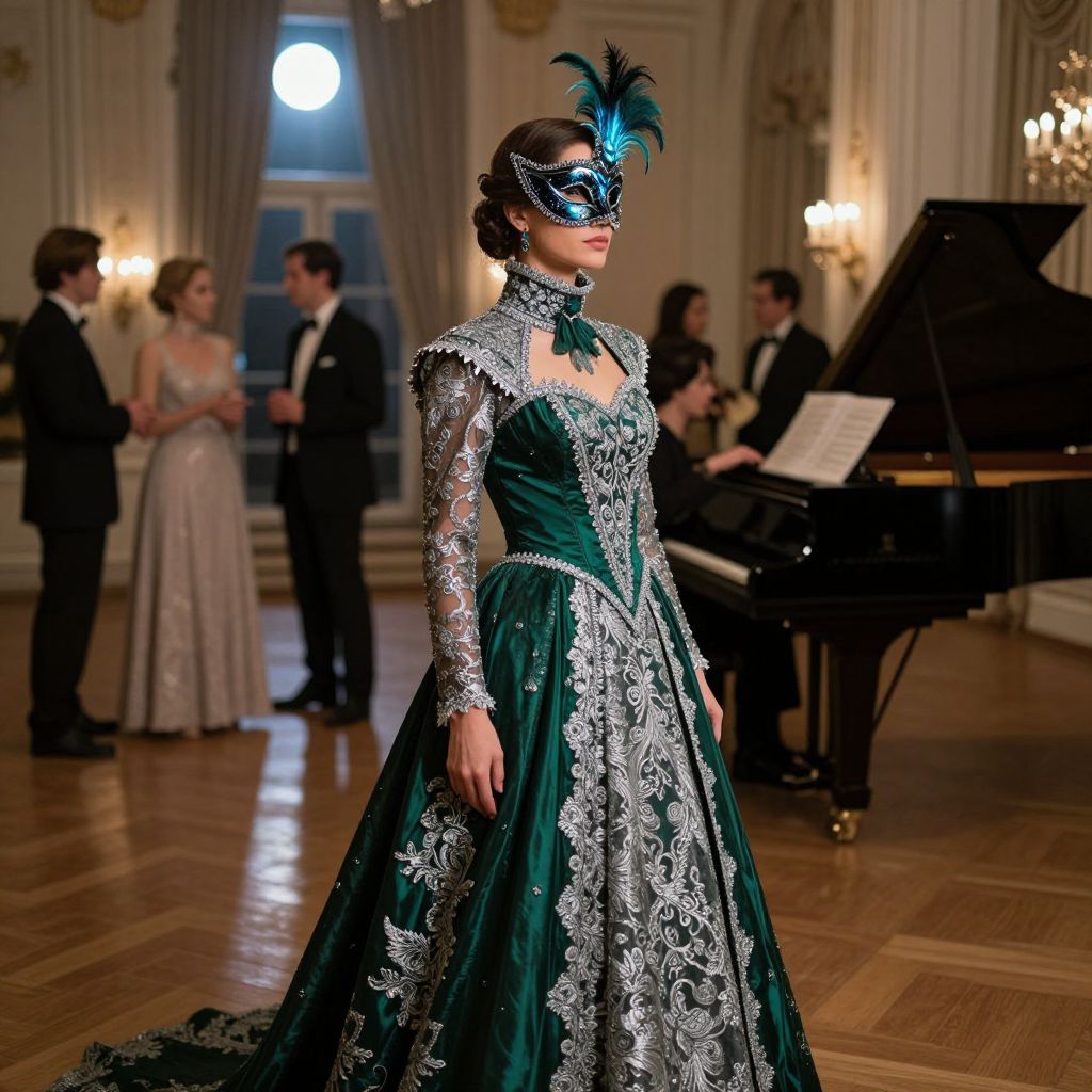 Photograph of a woman in an opulent ballroom. She wears an elaborate, dark green ball gown with intricate silver lace detailing and long sleeves. Her black hair is styled up, adorned with a blue feathered masquerade mask. In the background, a grand piano with sheet music rests on its stand, and several elegantly dressed people in formal attire, including a man in a tuxedo and a woman in a sparkling gown, stand near tall windows with heavy curtains. The room features ornate, classical architecture with warm, soft lighting from wall sconces. The wooden floor reflects the room's luxurious ambiance.