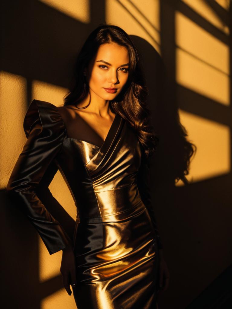 Portrait of an elegant woman wearing a shiny metallic satin dress with one long sleeve and a deep diagonal neckline. The warm sunlight creates strong shadows and highlights, accentuating the contours of her face and dress. The background features geometric shadows, adding a modern and artistic atmosphere.