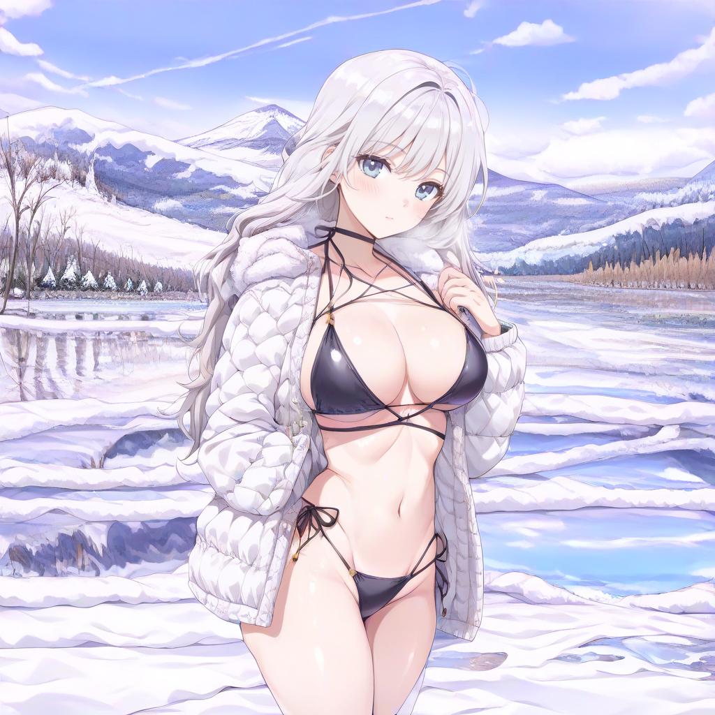 (masterpiece), (best quality:1.4), absurdres, [:intricate details:0.2], 1girl, tree, snow, solo, outdoors, water, mountain, large breasts, bikini, long hair, scenery, winter, lake, (looking at viewer:1.2), day, sky, reflection
