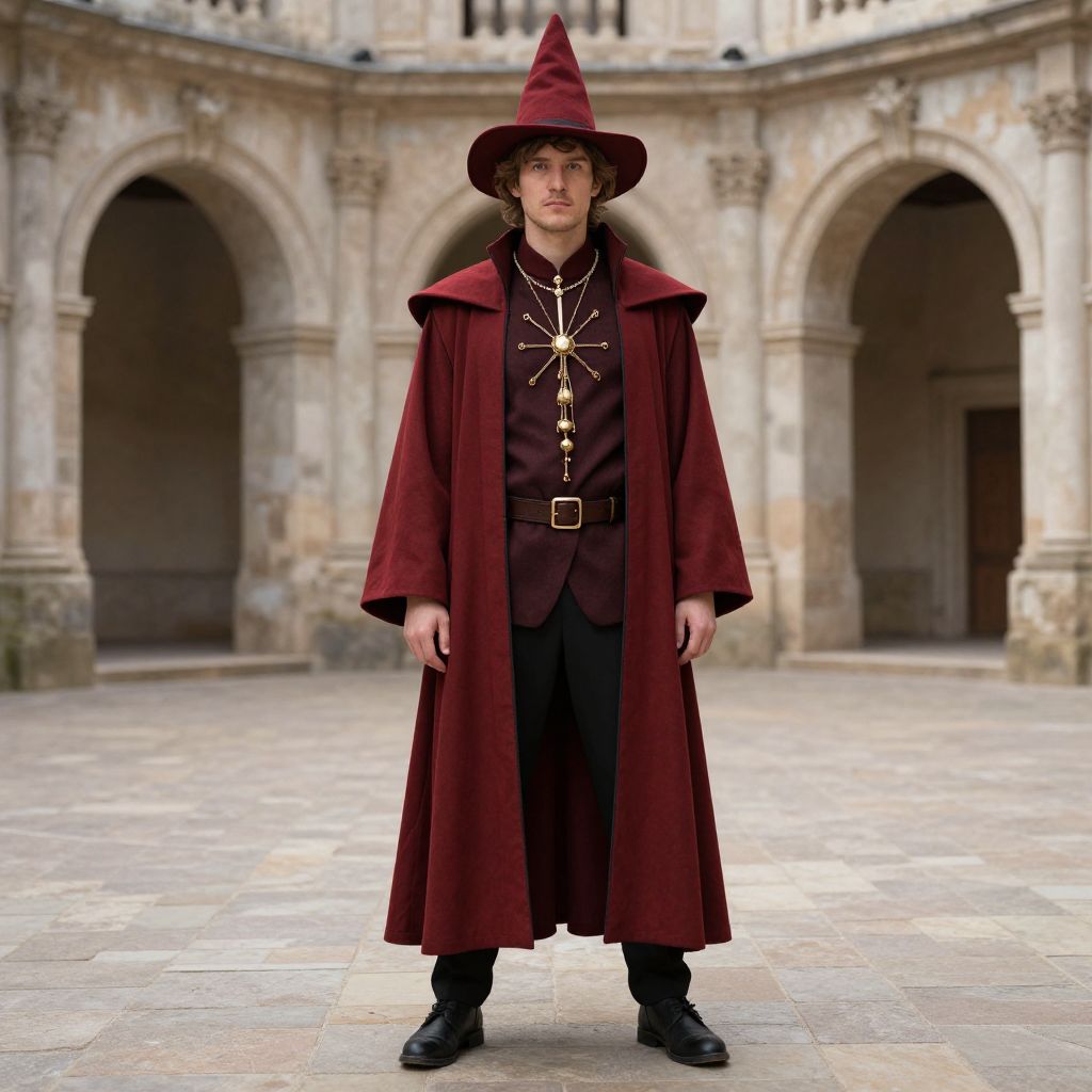 Modern Day Wizard Costume, man in a red hat and long coat standing in a courtyard