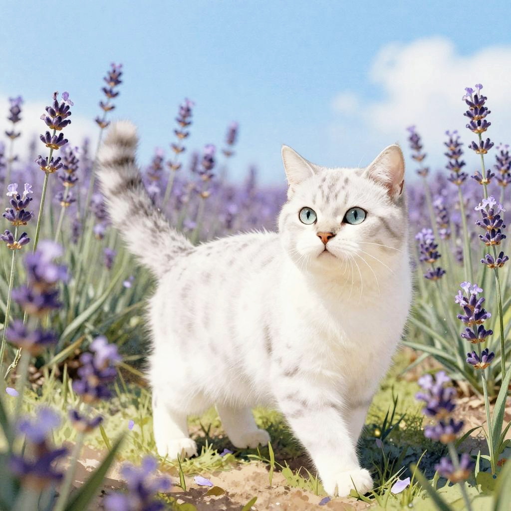 Spotted white cat playing in a field of lavender under a bright blue sky, delicate spots contrasting against the white fur, petals gently swirling around, evoking a serene springtime scene, watercolor style illustration.