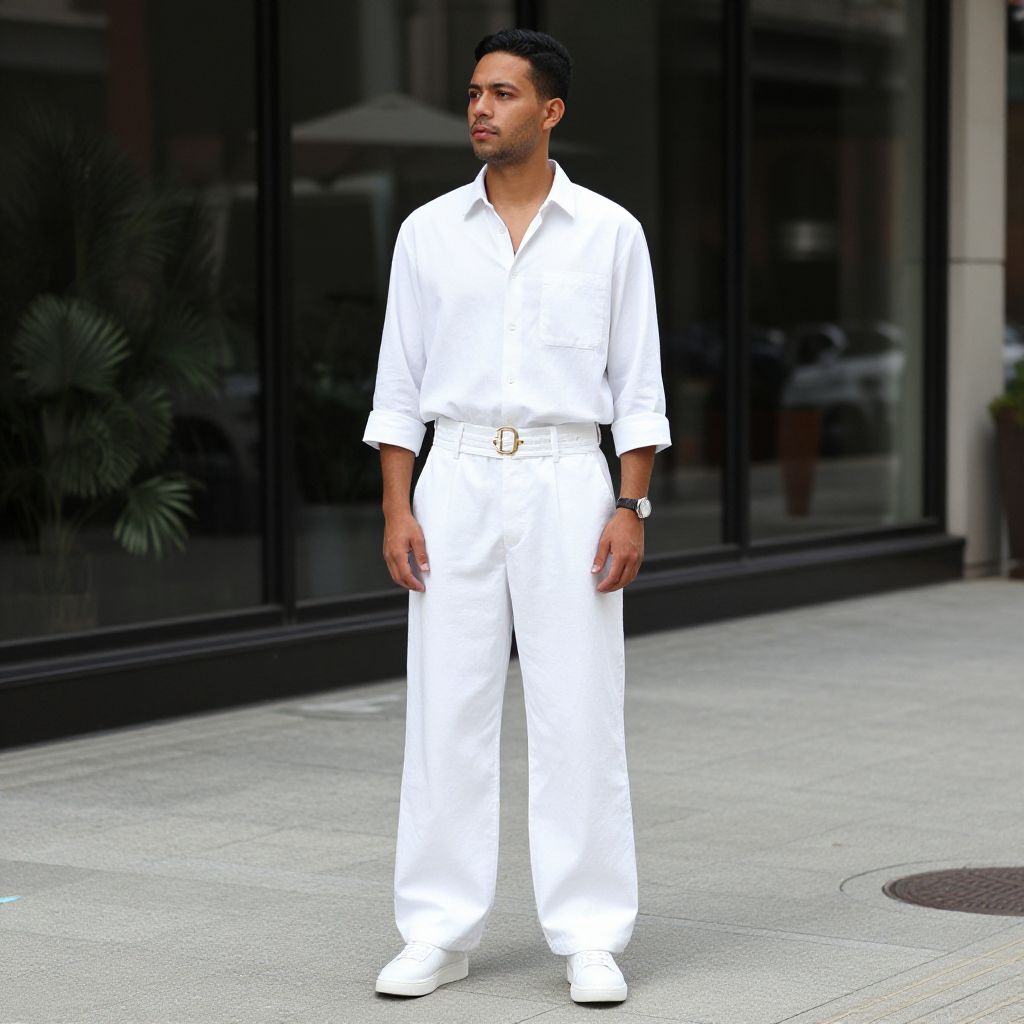 "White Jumpsuit Costume, man in white shirt and white pants standing on sidewalk"