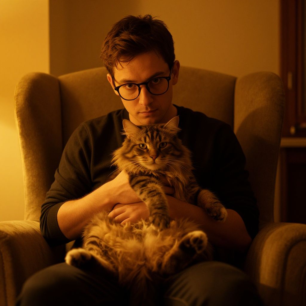Man with White British Shorthair in Serene Landscape
