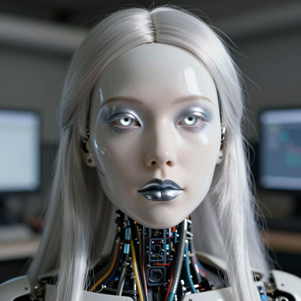Photorealistic CGI of a cybernetic woman with silver hair, pale skin, metallic eyes, black lips, and exposed robotic neck, set in