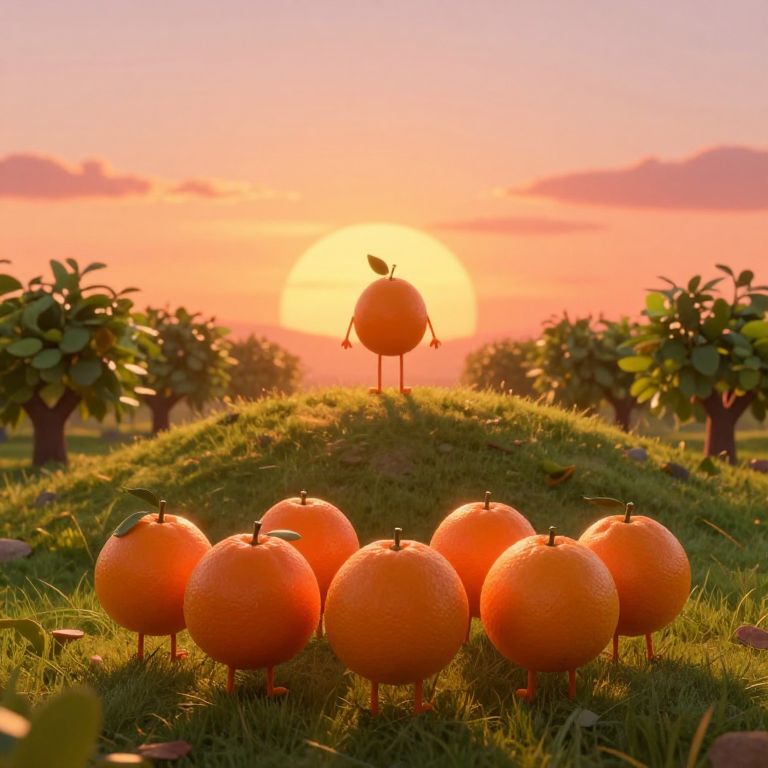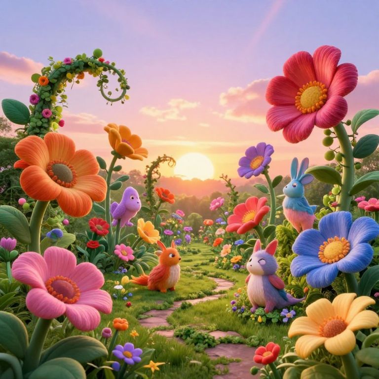 Frutopia landscape featuring vibrant, oversized fruits forming surreal architecture, luscious greenery blending with colorful fruit textures, dreamy sunset sky with soft pink and orange hues, whimsical and fantastical atmosphere, highly detailed and vivid colors.