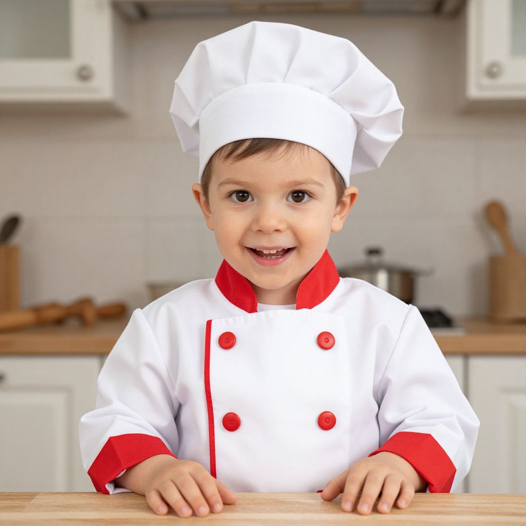 Toddler Chef Costume, young child wearing a chef's hat and jacket