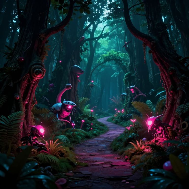 Forestpunk aesthetic, neon-lit pathways winding through shadowy woodland filled with hybrid flora and glowing robotic insects, remnants of futuristic technology fused into organic tree trunks, deep contrast lighting with vibrant neon pinks, teals, and dark forest greens