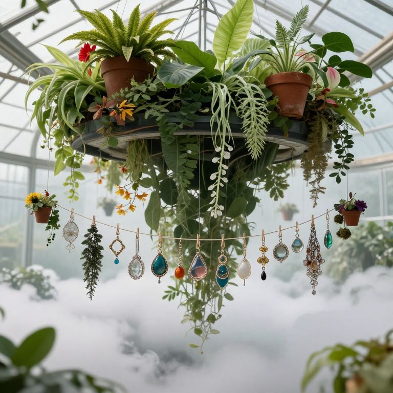 In a floating greenhouse suspended upside-down above clouds, gravity-defying plants grow and bloom clothesline after clothesline of living, shifting jewelry.