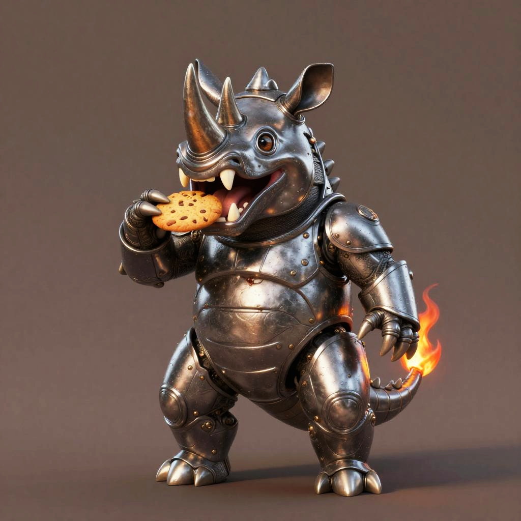 Steel-Plated Rhino Creature Eating Cookie