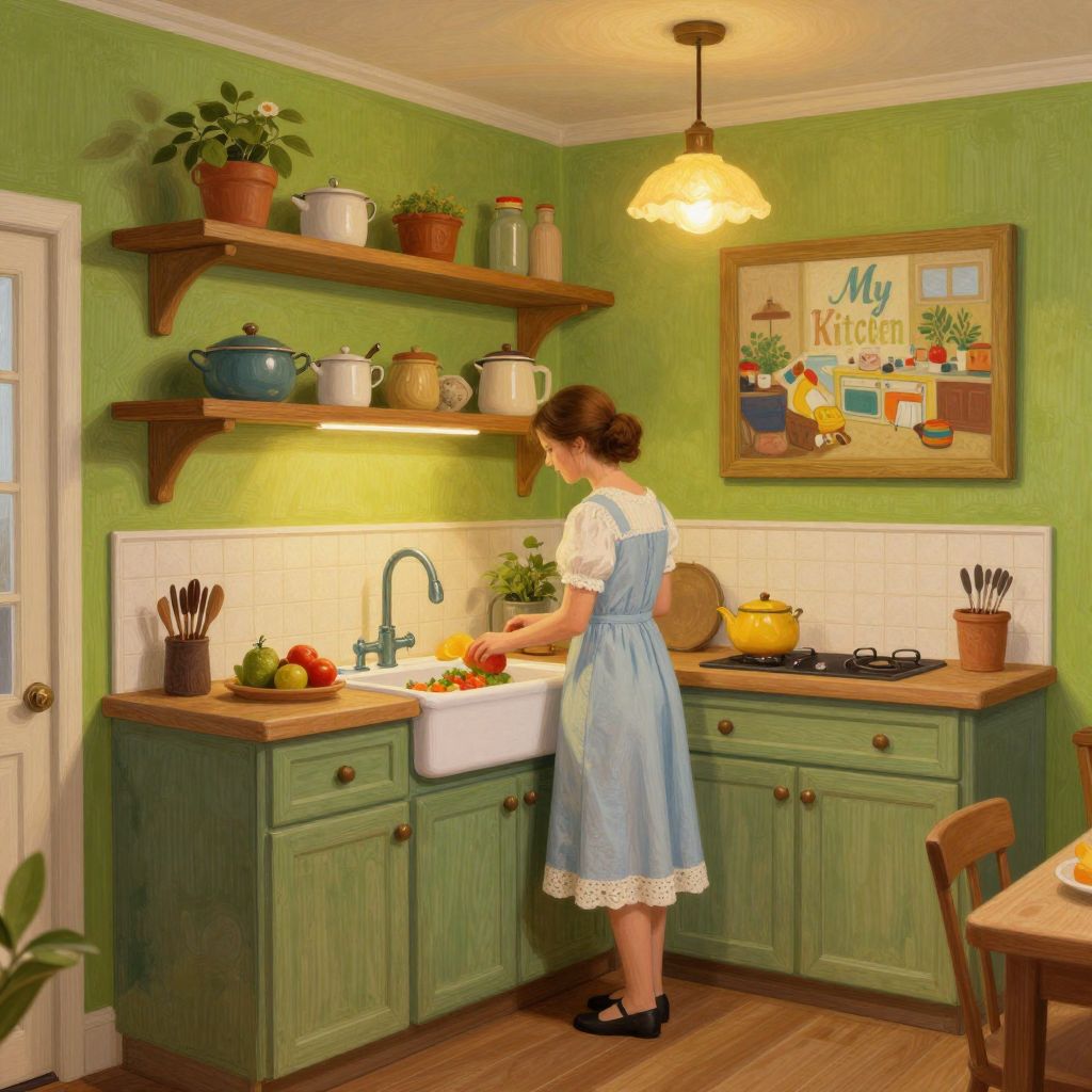 A cozy, retro-inspired kitchen scene rendered in a detailed digital art style, featuring open shelving, vibrant green walls, and warm, inviting lighting reminiscent of Harold Harvey's \"My Kitchen\" painting, with a woman in a light blue dress preparing food at the sink.