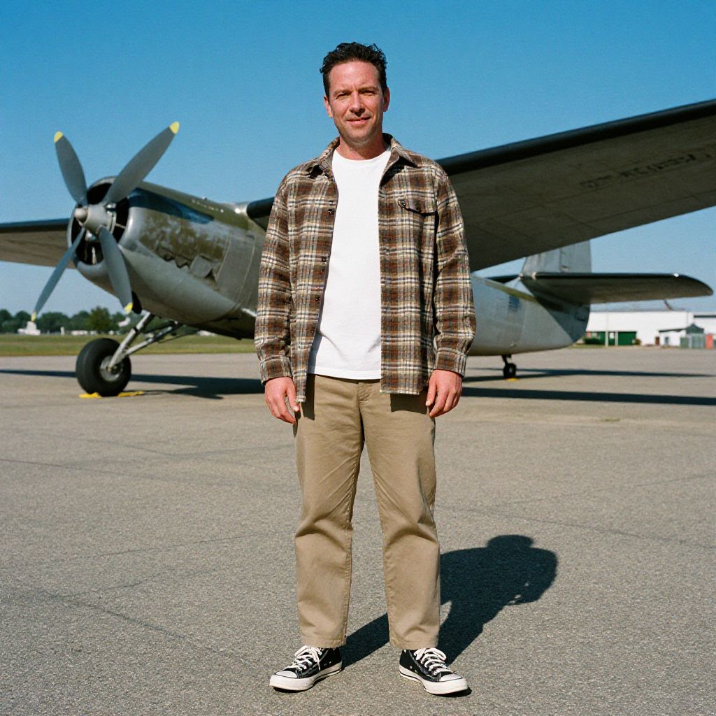 A man, relaxed-fit plaid flannel shirt, earthy tones, layered over plain white tee, khaki chinos, classic canvas high-tops, expansive runway, vintage aircraft on display, vibrant blue sky overhead, medium format film, casual smile. Man has masculine face and piercing eyes