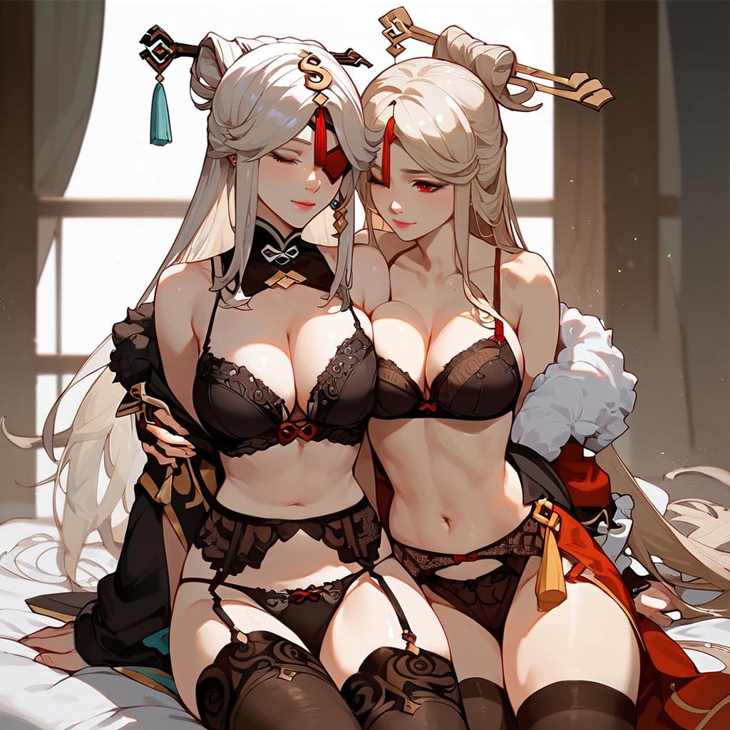 (score_9, score_8_up, score_7_up, score_6_up, score_5_up, score_4_up), beidou_(genshin_impact), ningguang_(genshin_impact), multiple_girls, 2girls, thighhighs, breasts, underwear, eyepatch, yuri, bra, hair_ornament, large_breasts, garter_belt, cleavage, panties, brown_hair, long_hair, smile, hairpin, closed_eyes, white_hair, red_eyes, bangs, hug, navel, one_eye_covered, hair_stick, white_background, collarbone, bare_shoulders, black_bra, thighs, simple_background, black_panties, parted_bangs, tassel_hair_ornament, off_shoulder, blush, closed_mouth, black_thighhighs, tassel, hug_from_behind, lingerie, hair_over_one_eye, garter_straps