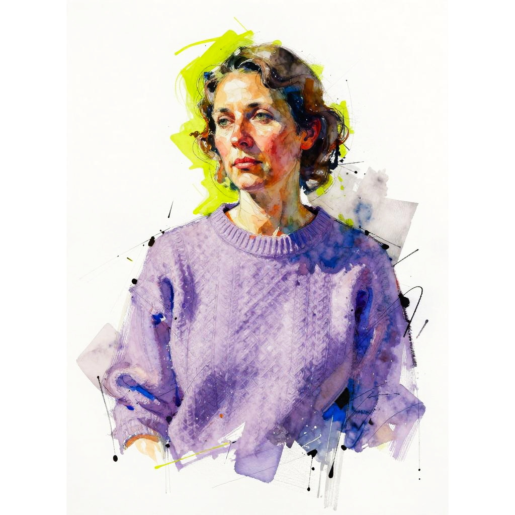 Expressionist semi-abstract portrait of fragmented middle-aged woman in periwinkle sweater with jagged lime-green silhouette, rendered in expressionist watercolor with wash effects and sharp layered scratch marks, high-contrast bold colors, loose gestural strokes and textured paint ridges, minimal white negative space with asymmetrical crop, cobalt-shadow accents and suggestive contours, emotive quiet resilience and muted determination, contemporary art poster vibe, painterly chaos with subtle drips, unresolved edges, luminous highlights.