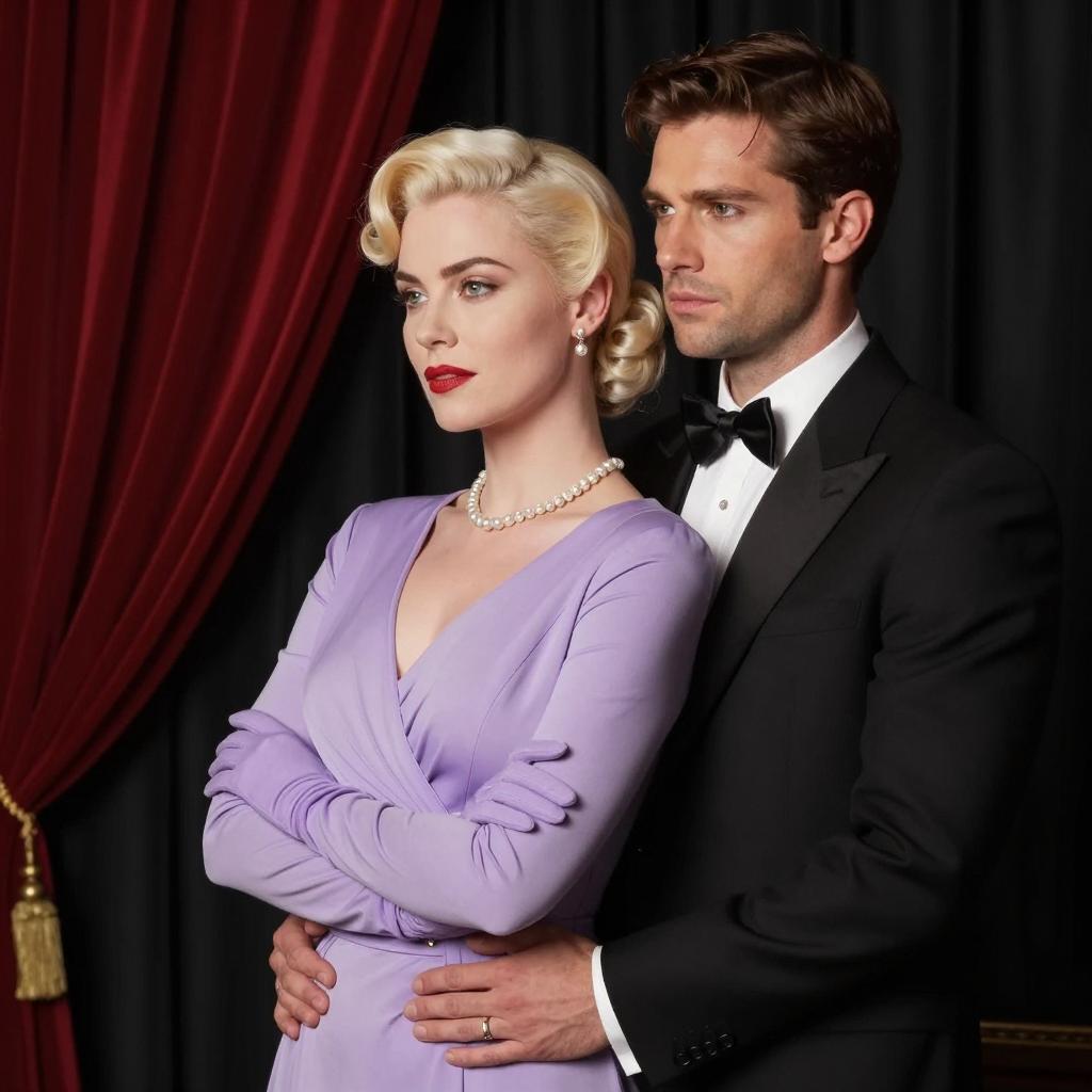 Group of men in black tuxedos with white shirts and red striped ties surround a woman in a pink strapless gown with pink gloves and a large necklace. She has blonde hair and red lipstick. Men's faces are serious, woman looks to the left. Red background. Eleven men, one woman.