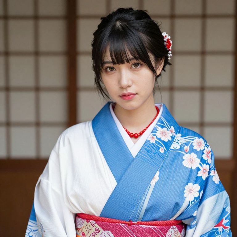 Female wearing a blue and white kimono with red accents and a red necklace.