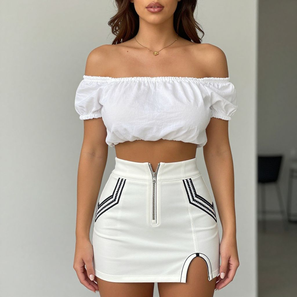 "Woman, casual chic, off-the-shoulder white crop top, short puff sleeves, high-waisted white mini skirt, black piping and geometric embroidery, exposed zipper detail.. Sexy. Pretty face and beаutiful eyes. Big breasts."