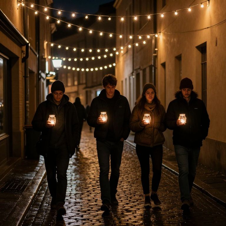 People walk down a dimly lit, atmospheric alleyway, holding glowing glass jars that illuminate their path, while strings of warm lights dangle above, casting a cozy glow over the wet cobblestone street and surrounding buildings.