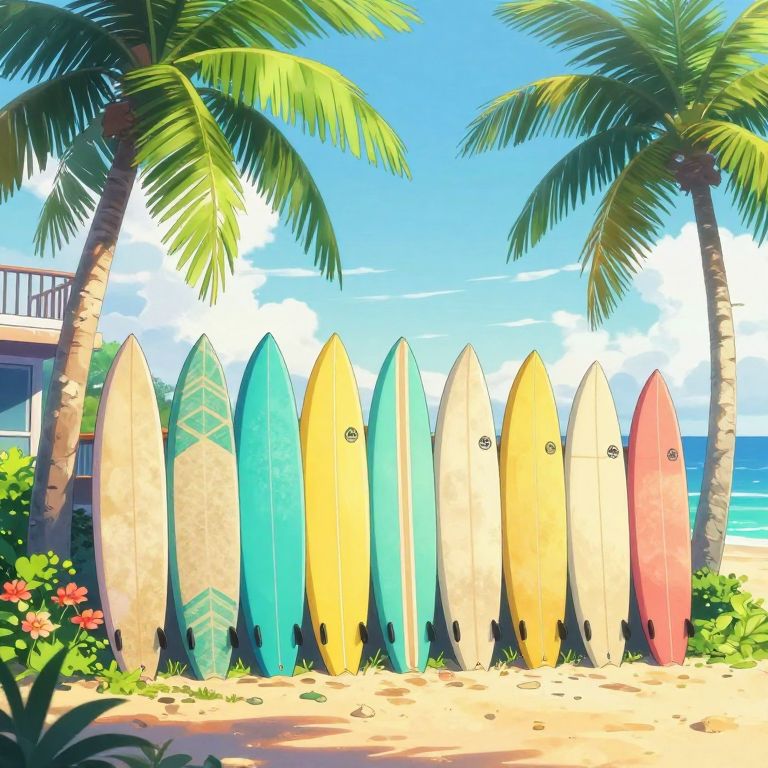 A vibrant anime-style illustration of a tropical coastal scene, The composition features a row of colorful surfboards standing upright in the sand, arranged neatly against the backdrop of a sunlit beach, The surfboards are in various bright shades, including yellow, teal, and white, with distinct patterns and details such as stripes and logos, adding to the lively atmosphere, Towering palm trees with lush green fronds frame the scene on both sides, their leaves swaying gently in the breeze, The sky is a soft pastel blue, adorned with fluffy white clouds that enhance the warm, tropical vibe, On the left, a modern building with a balcony is partially visible, its exterior slightly weathered to match the beachside setting, Brightly colored flowers and lush greenery surround the base of the surfboards, adding natural accents to the sandy ground, The lighting is warm and natural, casting soft shadows that highlight the details of the surfboards, palm trees, and nearby plants, This artwork perfectly captures the carefree, sunny ambiance of a tropical paradise, blending clean anime-style lines with vibrant, summer-inspired colors