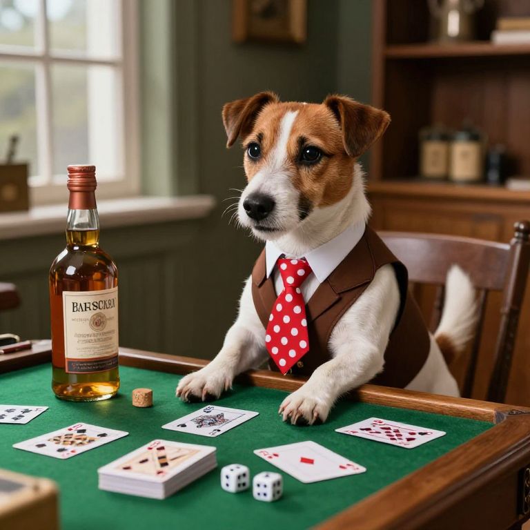 In the image, a Jack Russell terrier is depicted in a highly detailed and whimsical scene, sitting at a wooden table adorned with a green felt surface. The dog, dressed in a brown vest and a red and white polka-dotted tie, exudes a sense of sophistication and charm. On the table, there is a bottle of scotch, half-filled, with a cork nearby, suggesting a moment of relaxation. Scattered around the table are several playing cards, including a deck of cards and a pair of dice, hinting at a game of chance. The dog's paw rests on the table, adding to the sense of engagement with the scene. The background features a rustic setting with a window, a wooden shelf, and various other objects, creating a cozy and inviting atmosphere. The overall composition is well-balanced, with the dog as the central figure, surrounded by elements that enhance the narrative of a leisurely evening spent in a relaxed and stylish manner.