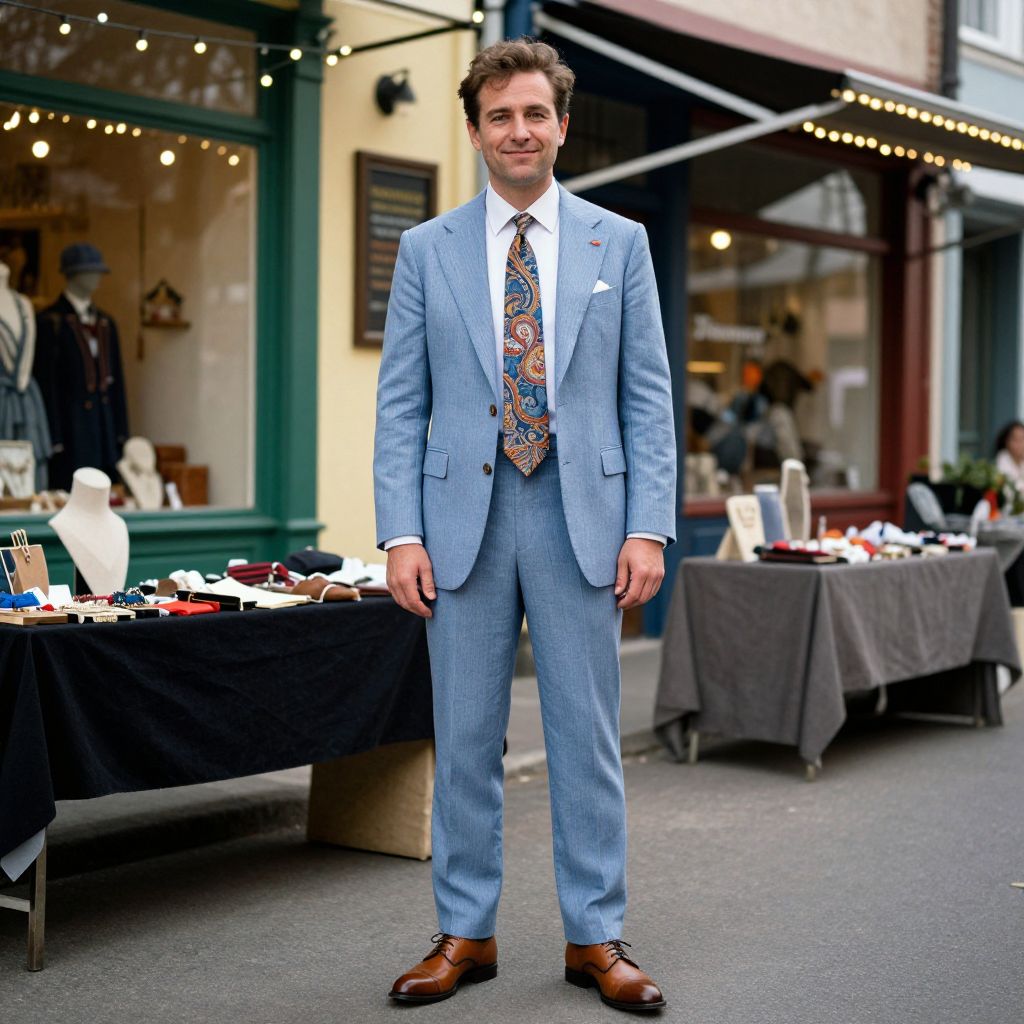 Photograph of a smiling white man with short brown hair, wearing a light blue checkered suit, white dress shirt, and multicolored patterned tie, paired with brown leather dress shoes. He stands in front of outdoor market tables covered with black cloths, displaying various jewelry and small items. The background includes a green-framed shop window with string lights and blurred figures, suggesting a busy street market setting. The man's suit is well-fitted, and he exudes a polished, professional appearance. The image has vibrant colors and a sharp focus on the subject.