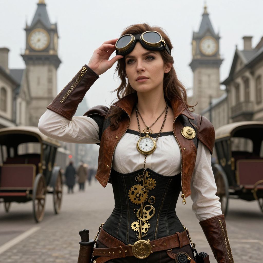 Steampunk woman in brown leather jacket, white shirt, black corset, and goggles, standing on foggy street with clock towers, vintage car