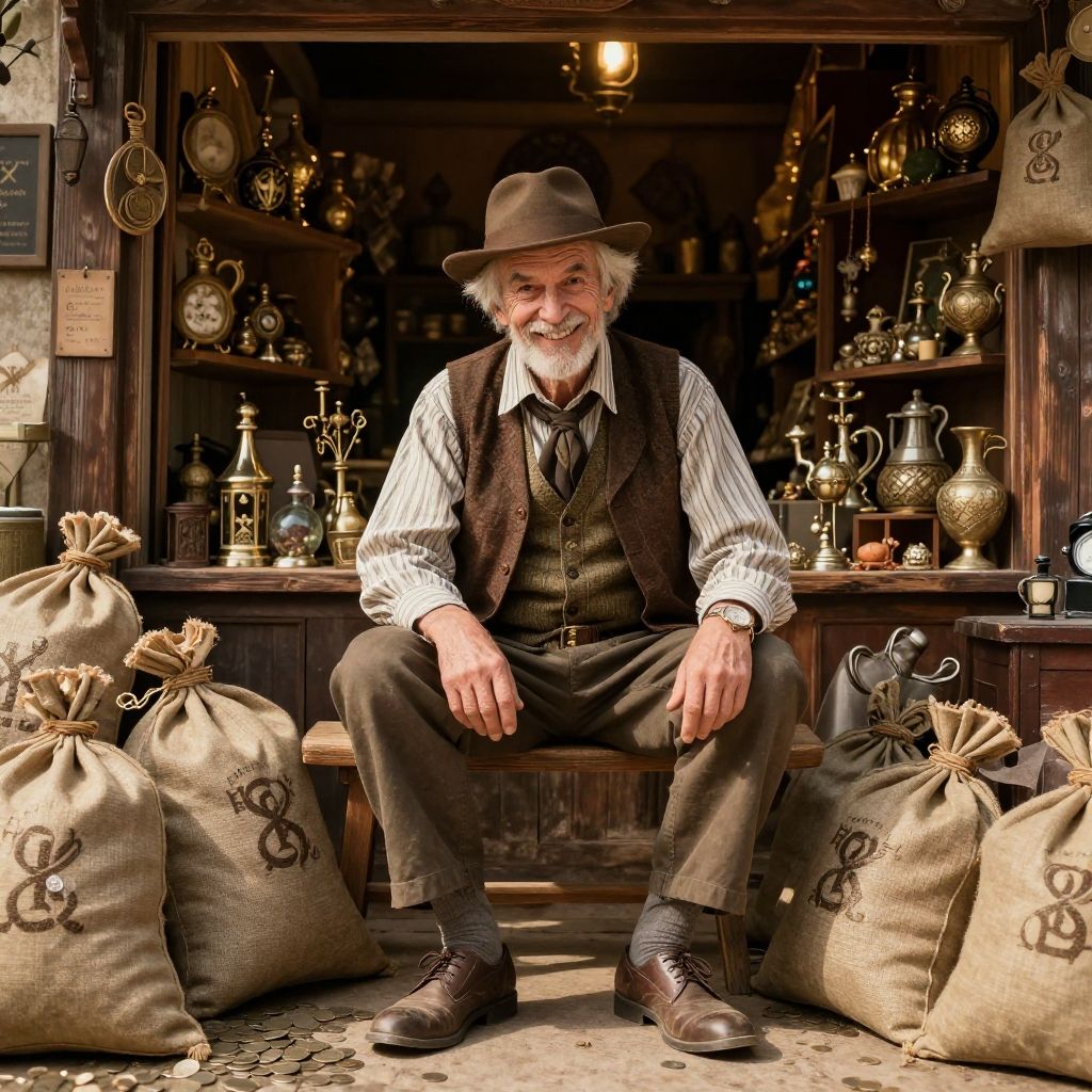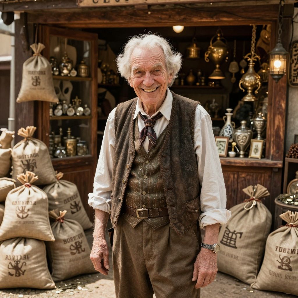 Moneymonger character portrait, old-world charm with a sly smile, surrounded by piles of coin sacks, rustic wooden shop filled with exotic treasures, warm sunlight filtering through