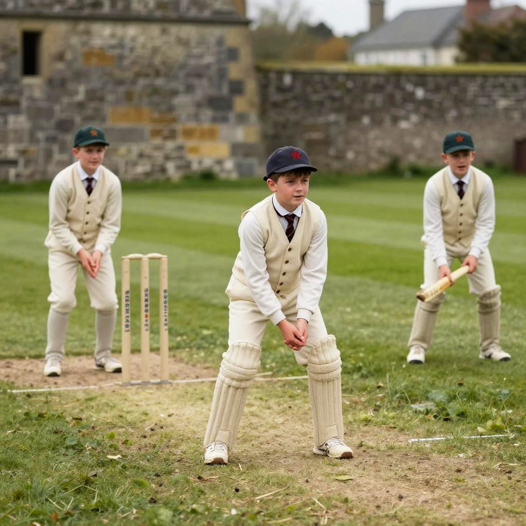 British schoolboy uniforms, early 20th century style with knee-length socks, button-up vests, and caps, boys playing cricket on a lush green field beside old stone walls, nostalgic atmosphere