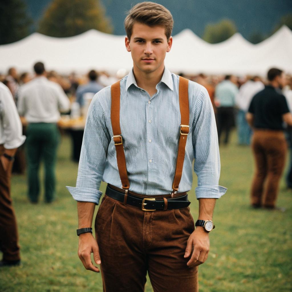Man oktoberfest outfit fancy,male focus, watch, 1boy, wristwatch, belt, shirt, looking at viewer, realistic, suspenders, collared shirt, solo, brown pants, pants, standing, short hair, blurry