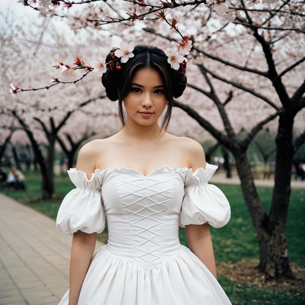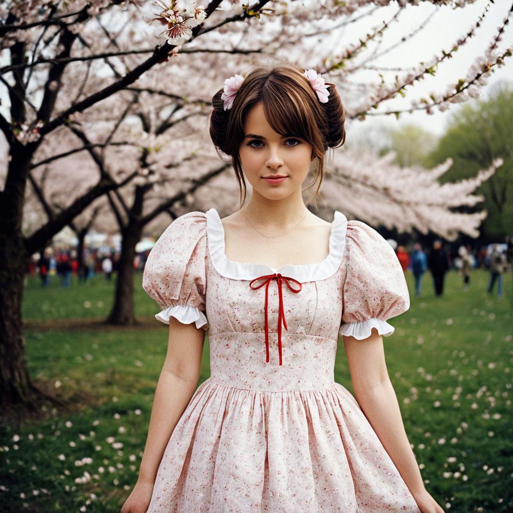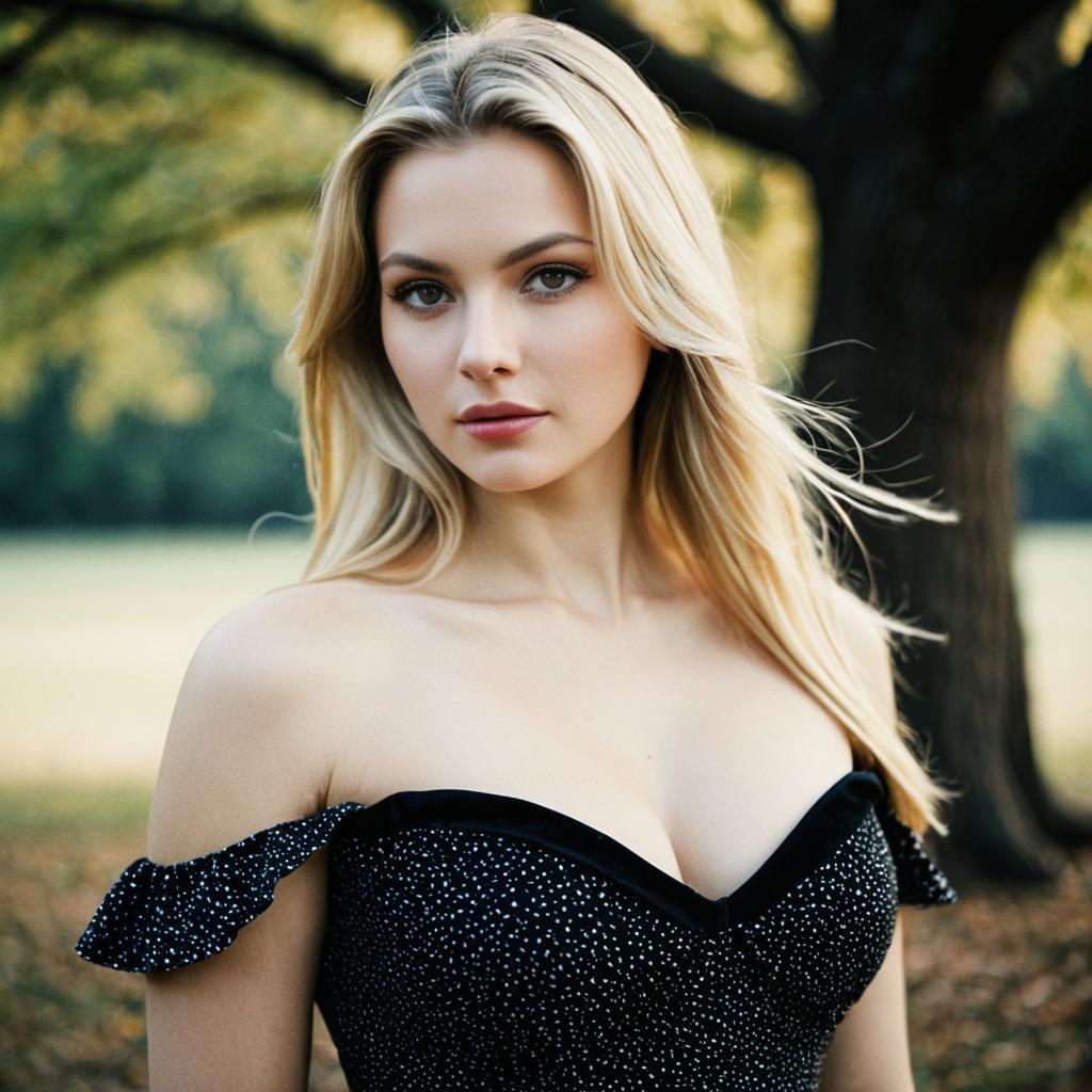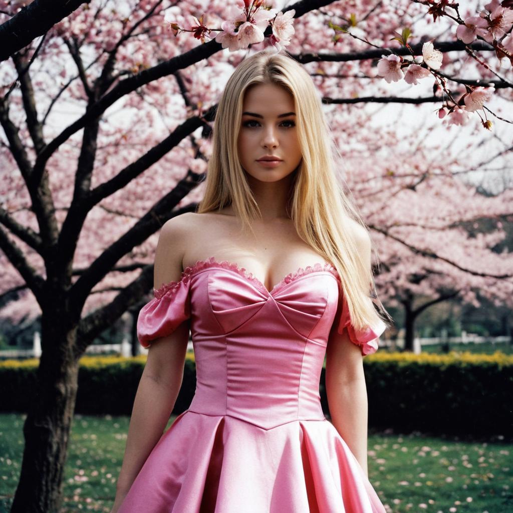 Halloween pink dress,1girl, solo, dress, blonde hair, long hair, realistic, pink dress, cherry blossoms, bare shoulders, tree, breasts