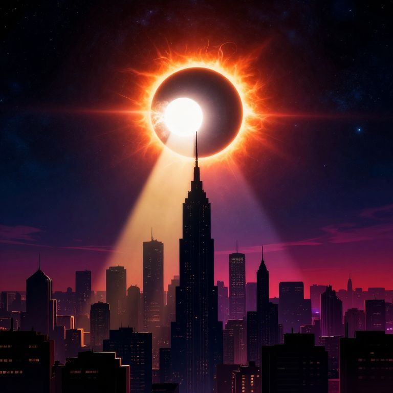 Eclipsed, a surreal cosmic landscape where a majestic solar eclipse casts dramatic shadows over a futuristic city skyline, vivid colors blending with dark silhouettes, intricate details in the sky and architecture, high contrast lighting, digital art style