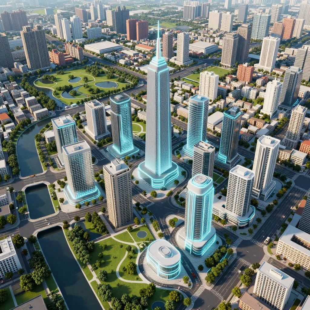 AI city map generator rendering a vibrant modern city from above, showing diverse neighborhoods, parks, rivers and transport routes, illustrated in a sleek minimalistic style with glowing neon outlines and subtle 3D effects, blending sci-fi and cartography aesthetics.
