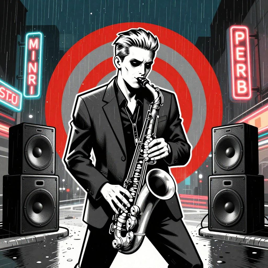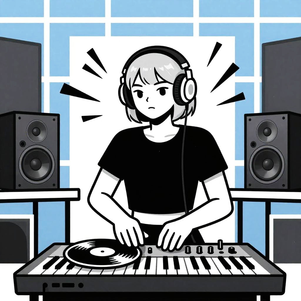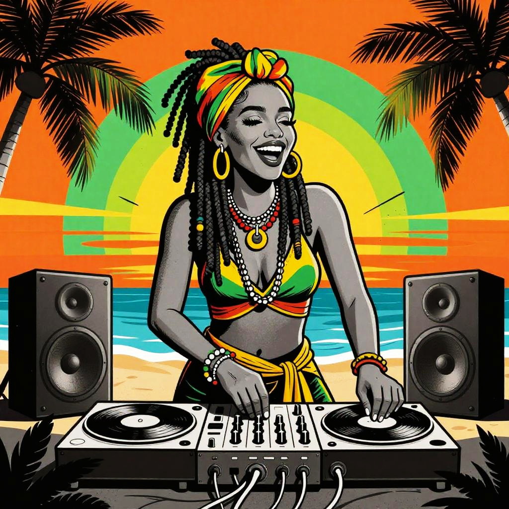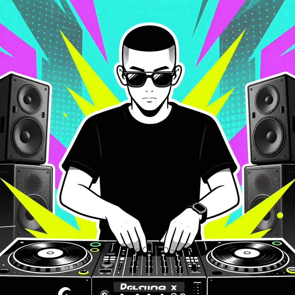 A bold, high-contrast graphic digital illustration of a dynamic male drummer with sweatband and drum sticks in mid-air, hands working a sleek mixer and vinyl, flanked by two towering speakers in a open-air desert music festival under starry sky. Background awash in vibrant orange with teal and maroon geometric swirls, radiating lively, energetic vibes. Thick black-and-white outlines, crisp edges, duotone shading, subtle paper grain, punchy saturation, dynamic composition, motion lines, bassy atmosphere.