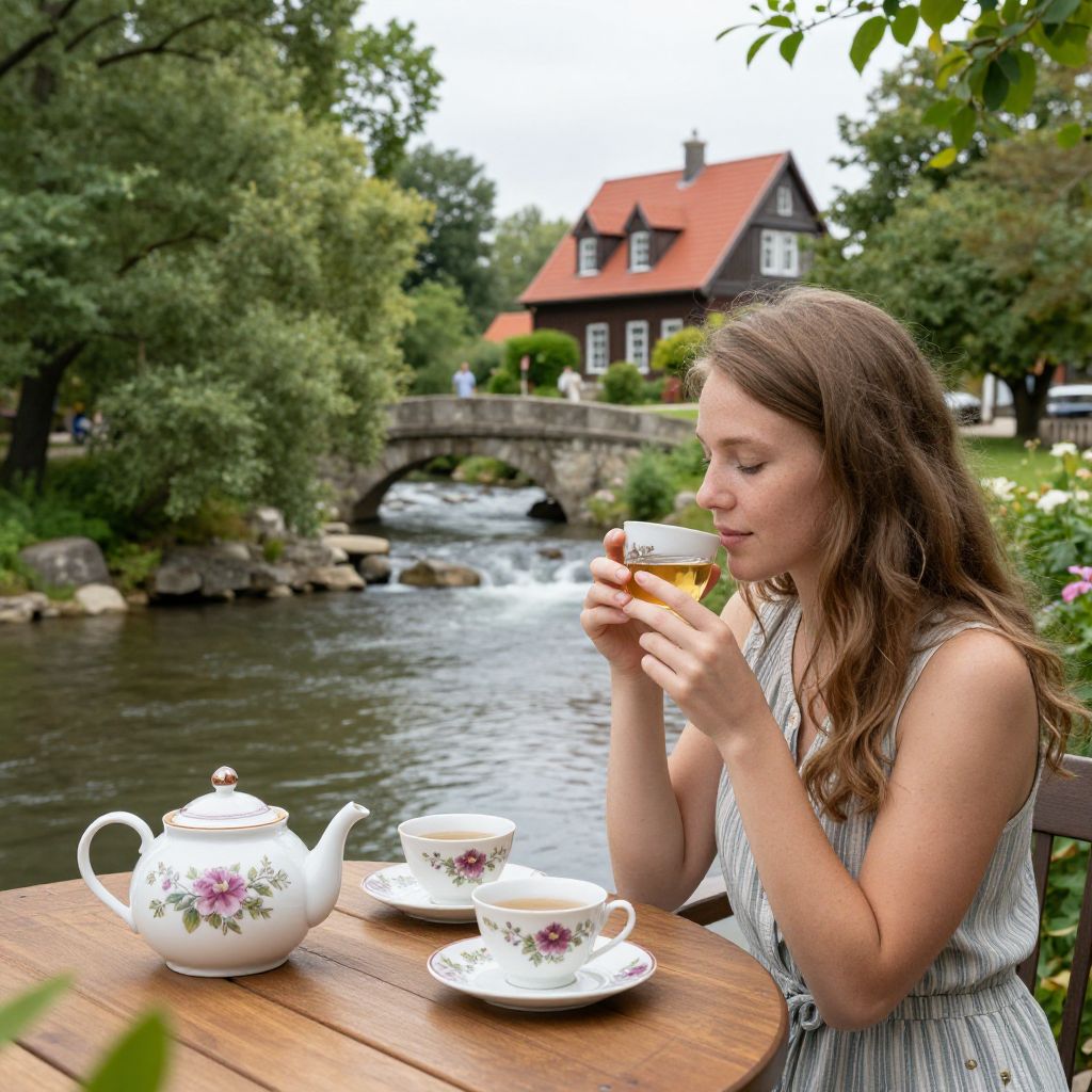Woman enjoying tea at a picturesque riverside setting, with two cups and a floral teapot on a wooden table, surrounded by lush greenery, a stone bridge, and a quaint house with a red roof in the background.