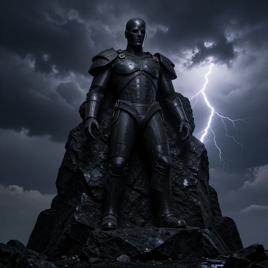 Photograph of a dark, metallic Iron Man statue standing on a rocky pedestal against a stormy, cloud-filled sky. The statue, detailed with armor plating and gauntlets, is illuminated by a bright, jagged lightning bolt striking from the right. The overall color palette is dominated by deep blues and blacks, with the lightning adding a stark, white contrast. The texture of the statue's armor is highly detailed, and the rocky pedestal is rough and uneven. The dramatic lighting enhances the heroic and powerful presence of the Iron Man figure.