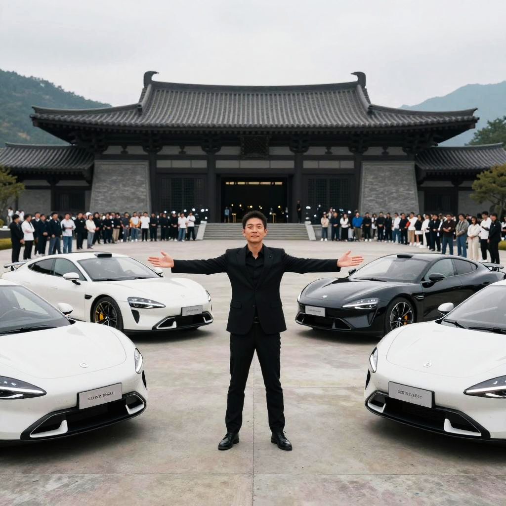 Photograph of a man standing in the center of a concrete lot, arms outstretched, surrounded by sleek, futuristic white and black sports cars. He's dressed in a black suit. In the background, there's a large, modern building with a traditional Asian-style roof, and a crowd of people standing in formation. The scene is set against a cloudy, mountainous backdrop.