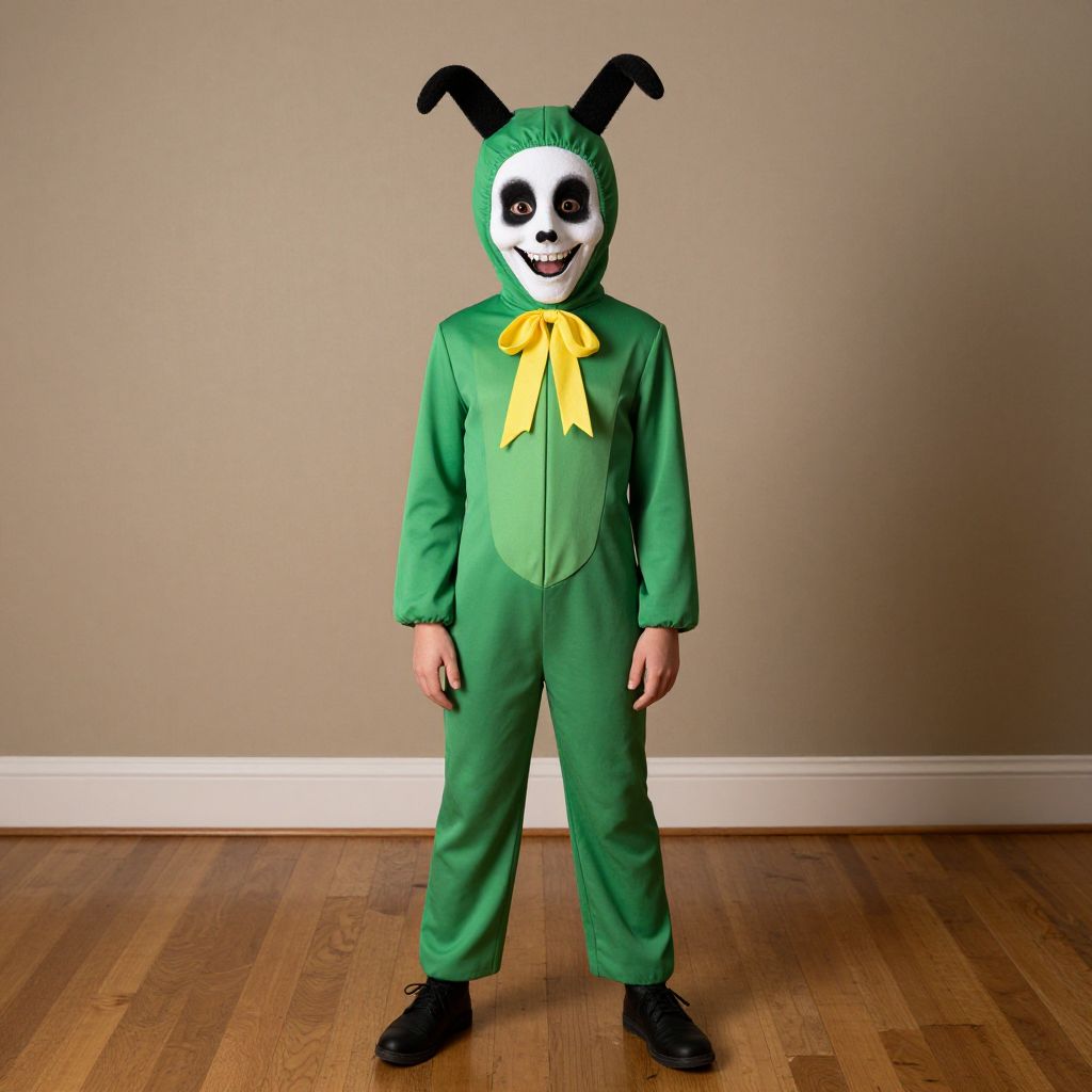 Photograph of a young child standing in a plain room with beige walls and wooden floor. The child wears a full green onesie with black bunny ears on the hood and a large white mask with black circles for eyes and a wide, grinning mouth. The mask has a sinister, clown-like appearance. The onesie has a yellow bow tie at the neck. The child's hands and feet are visible, wearing black shoes. The lighting is even, highlighting the plain background and the vibrant green of the costume. The image is centered and focused on the child.
