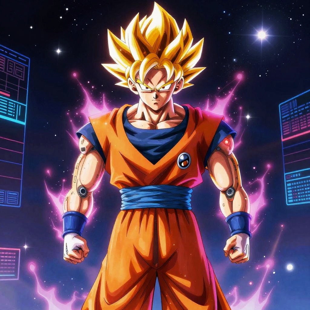 Dbz ai art concept of a fusion character combining AI robotics and Saiyan traits, detailed cybernetic limbs with glowing energy cores, intense battle-ready pose against a cosmic backdrop of stars and digital grids, vibrant neon colors emphasizing power and technology