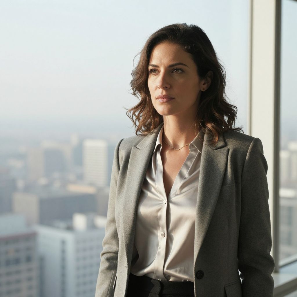 A realistic hero portrait of a middle-aged woman with kind eyes and a thoughtful gaze, standing on a city rooftop at dusk, wearing a simple yet strong leather coat, looking out over the skyline of a modern metropolis with a sense of quiet courage and resolve.