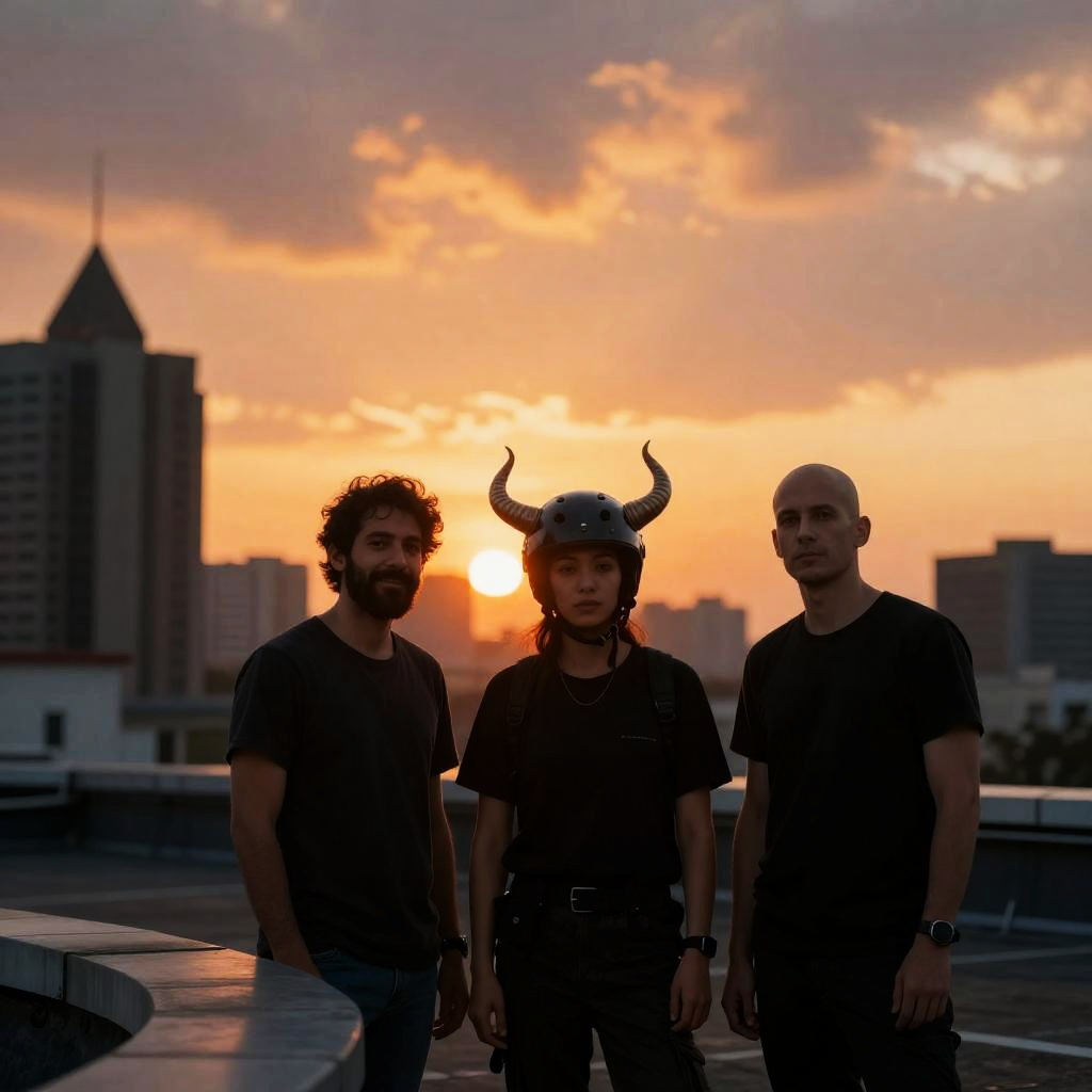 Photograph of three people on a rooftop during a sunset. The man on the left, with dark hair and a beard, smiles. The person in the center, wearing a helmet with horns, stands between the two. The man on the right, bald with a black shirt, looks ahead. The background features a fiery orange sky and a cityscape with tall, jagged structures. The rooftop has a curved edge in the foreground.