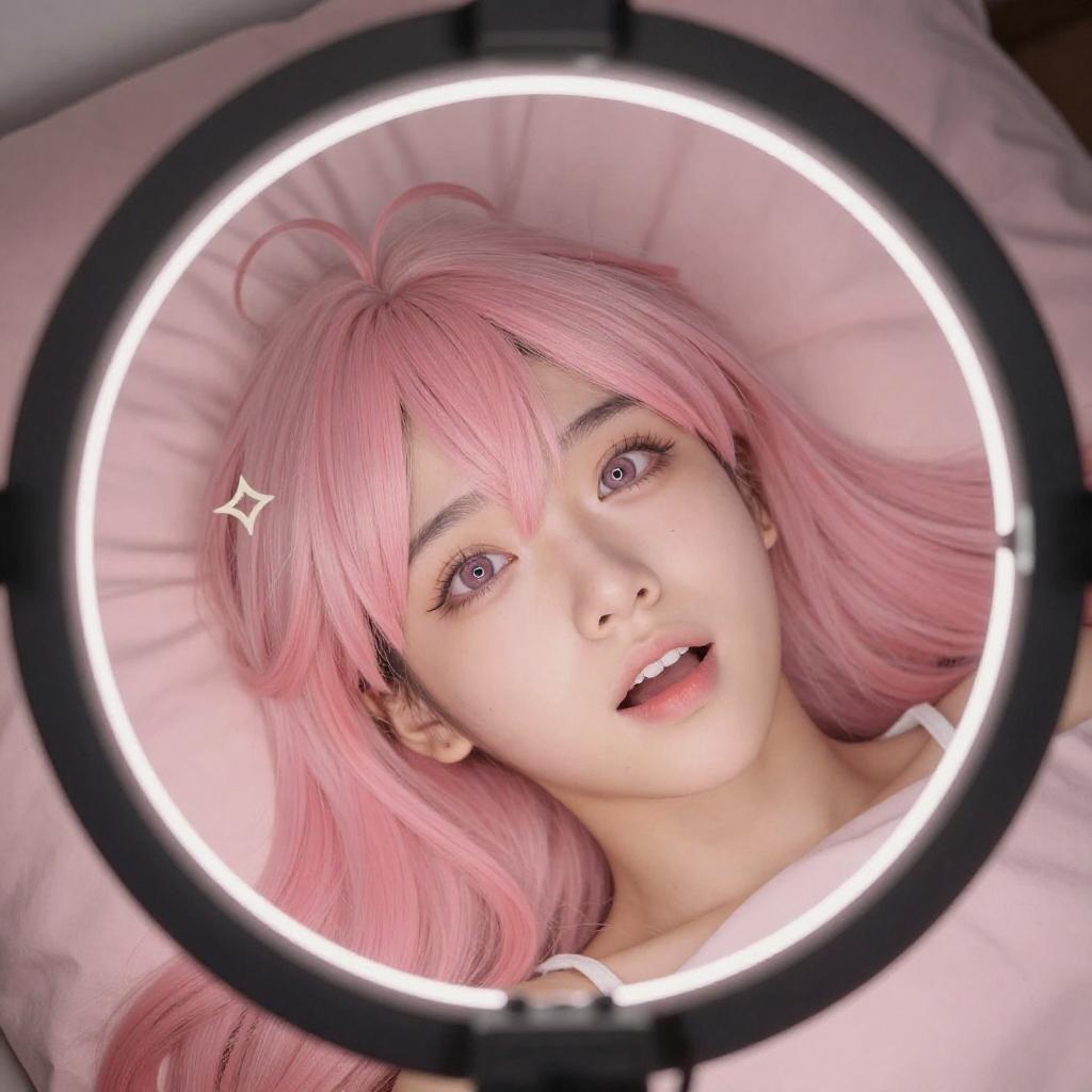 Photograph of a pink-haired anime-style woman with large eyes and a surprised expression, lying on a bed with pink sheets. A man's erect, circumcised penis is positioned near her face, with a shiny metal object above it. The perspective is from below, emphasizing the penis and her face.