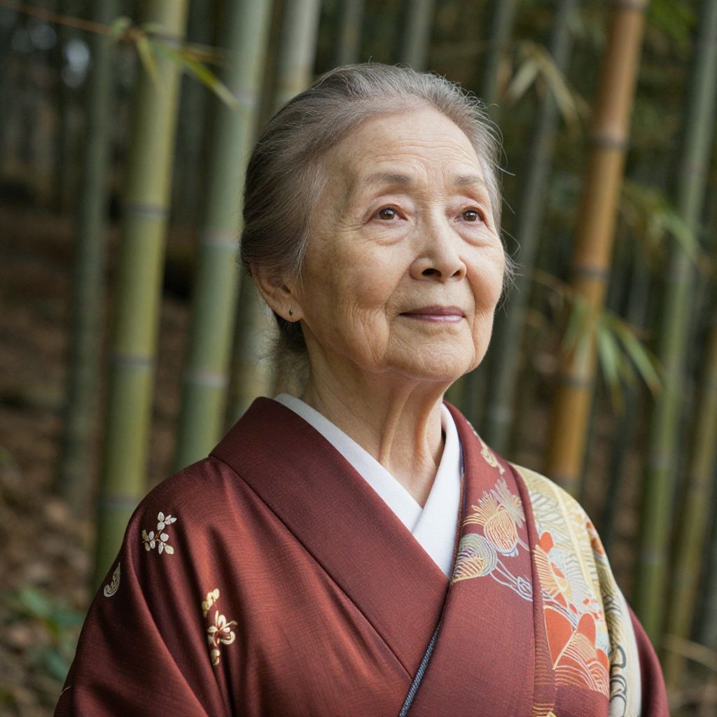 Photograph of an elderly Asian woman with light brown skin and gray hair tied back, wearing a maroon kimono with white and gold floral embroidery. She has a gentle smile and expressive eyes. The background features tall, green bamboo stalks with sunlight filtering through, creating a serene, natural setting. The kimono has a traditional Japanese design, and the light highlights her smooth, wrinkled skin. The overall tone of the image is warm and peaceful, capturing a moment of quiet reflection.